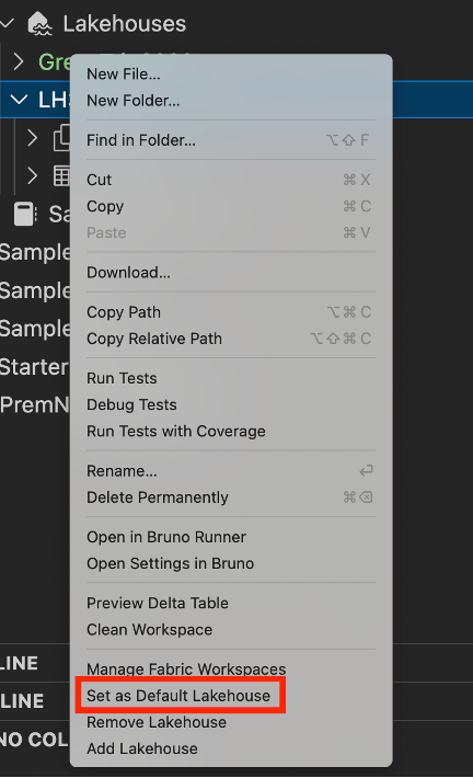 Pokud chcete nastavit výchozí lakehouse, klikněte pravým tlačítkem myši na lakehouse a vyberte Nastavit jako výchozí lakehouse.