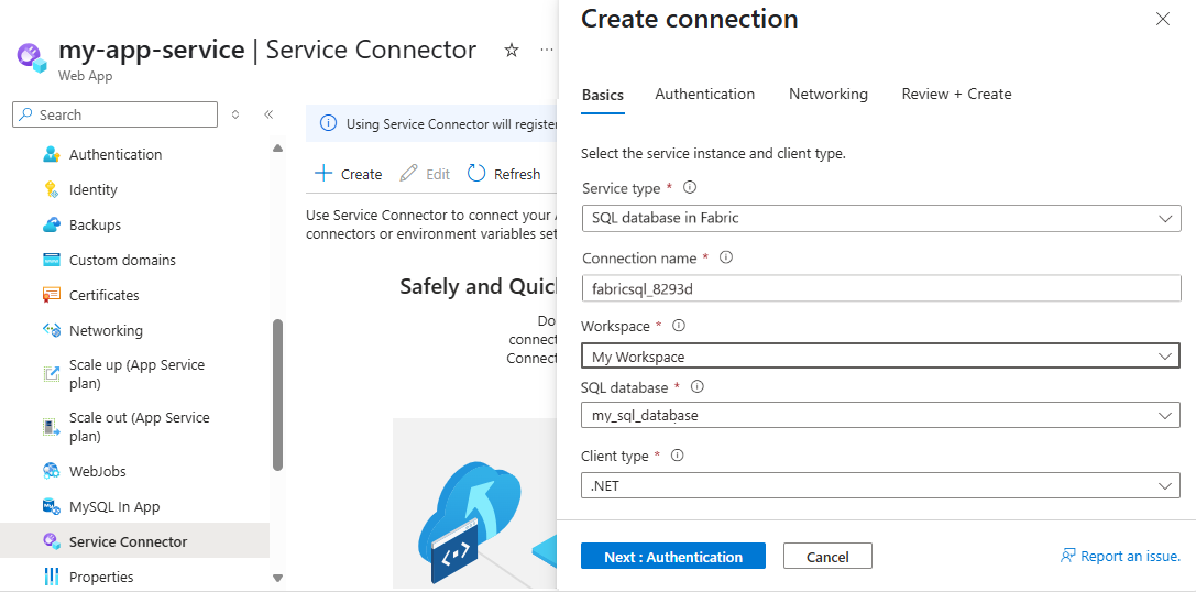 V této příručce se naučíte připojit prostředek služby Azure App Service k databázi SQL v Microsoft Fabric pomocí konektoru Service Connector. Toto nastavení umožňuje webové aplikaci bezproblémovou interakci s databází SQL v Microsoft Fabric.