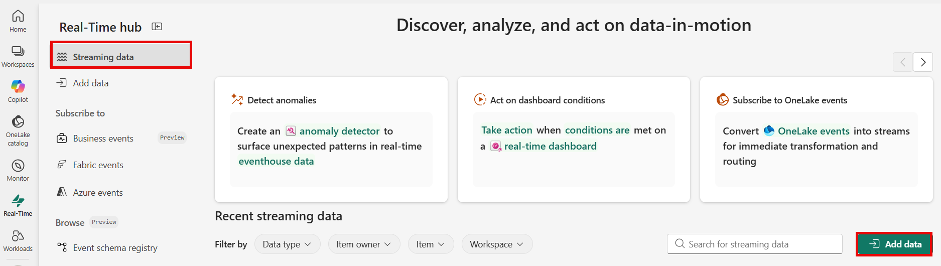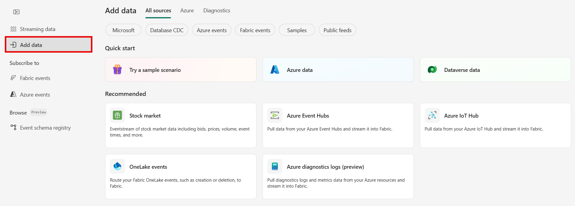 K datům se můžete připojit jak uvnitř, tak i vně platformy Fabric během několika málo kroků v rámci centra Fabric Real-Time. Ať už data pocházejí z nových nebo existujících zdrojů, datových proudů nebo dostupných událostí, prostředí Pro přidání dat umožňuje připojit se k široké škále zdrojů událostí přímo z centra Real-Time.