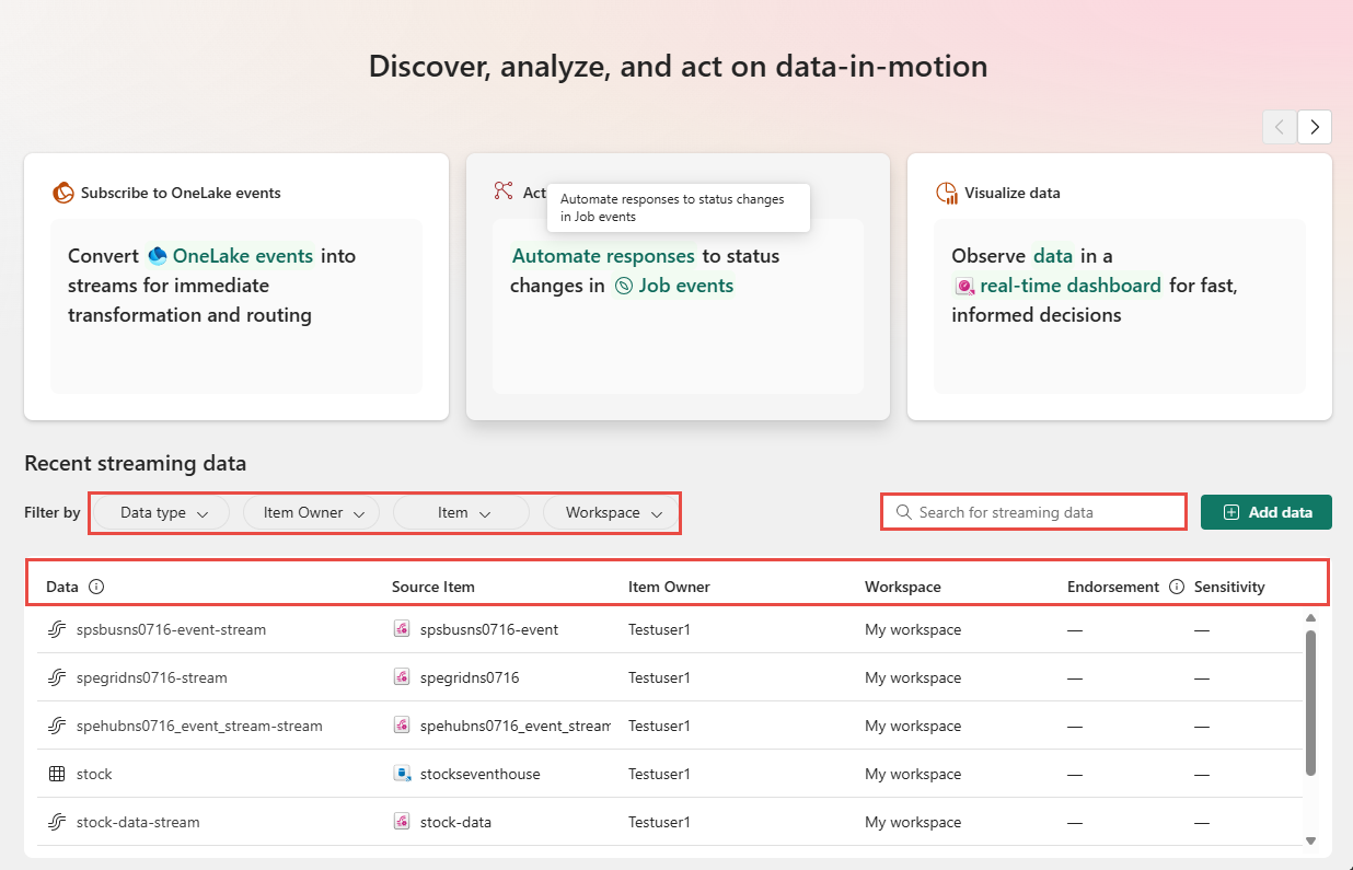 V části Všechny datové proudy v dolní části uvidíte všechny datové proudy a tabulky, ke které máte přístup. Streamy jsou výstupy z Fabric eventstreamů a tabulky pocházejí z databází Kusto Query Language (KQL), k nimž máte přístup.