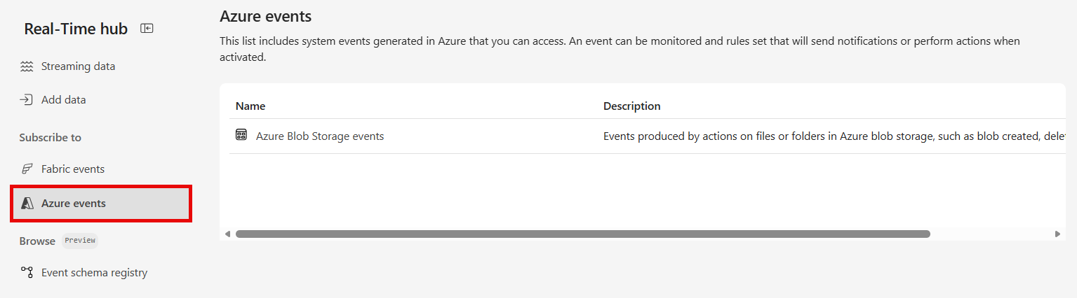 Na stránce událostí Azure se zobrazí seznam systémových událostí vygenerovaných v Azure , ke kterým máte přístup. Streamy událostí můžete vytvářet z úložiště objektů blob v Azure. Můžete také nastavit upozornění pro odesílání oznámení e-mailem, Teams atd. při výskytu události. Pomocí odkazů ze seznamu přejděte k článkům, které ukazují, jak vytvořit eventstreamy událostí pro události azure Blob Storage.