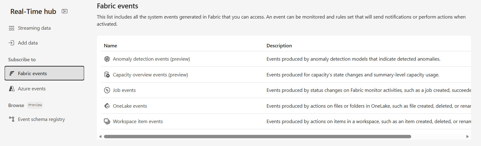- Přihlášení k odběru událostí OneLake – Poskytuje zástupce pro vytváření datových proudů založených na událostech Fabric OneLake. Podrobnosti najdete v tématu Přihlášení k odběru událostí OneLake.