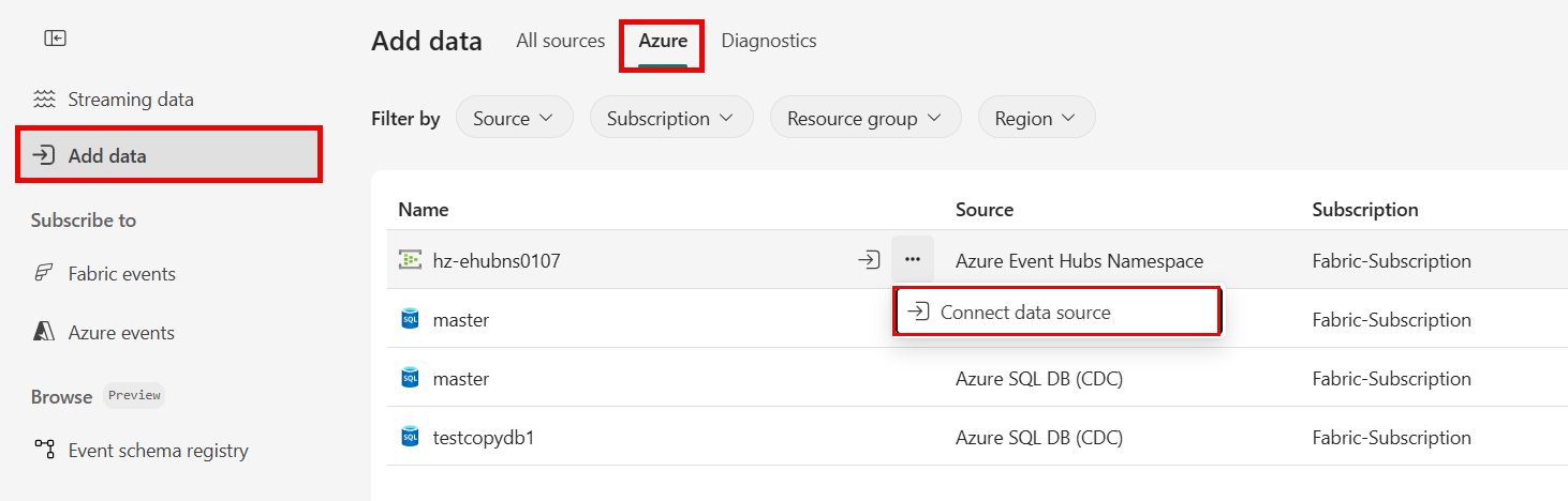 K těmto prostředkům se můžete připojit a vytvořit streamy událostí, které se zobrazí na stránkách Moje datové proudy a Všechny datové proudy . Výběrem odkazu pro zdroj v seznamu se dozvíte, jak pro tento zdroj vytvořit eventstream.