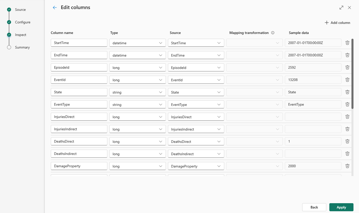 Některá mapování formátu dat (Parquet, JSON a Avro) podporují jednoduché transformace v čase ingestování. Pokud chcete použít transformace mapování, vytvořte nebo aktualizujte sloupec v okně Upravit sloupce.