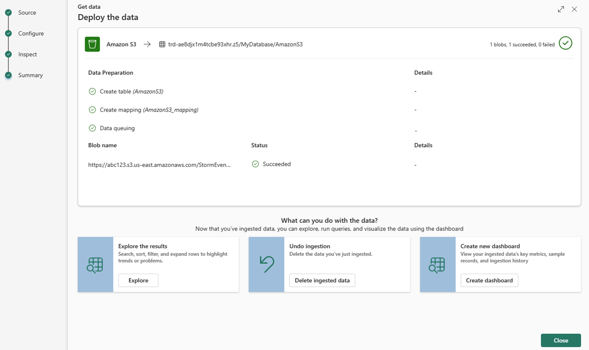 V okně Příprava dat jsou všechny tři kroky označené zelenými značkami zaškrtnutí, jakmile se příjem dat úspěšně dokončí. Můžete vybrat kartu pro dotazování, smazat ingestovaná data nebo zobrazit panel pro přehled souhrnu vašich dat.