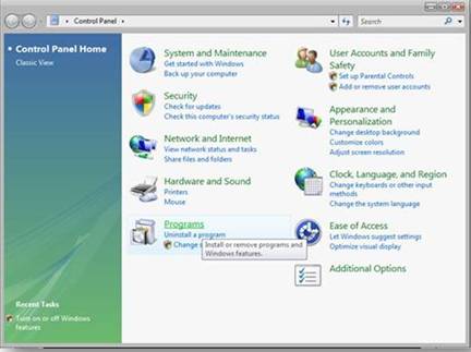 When the installation completes, the Windows Features dialog box closes, and the Control Panel is displayed.