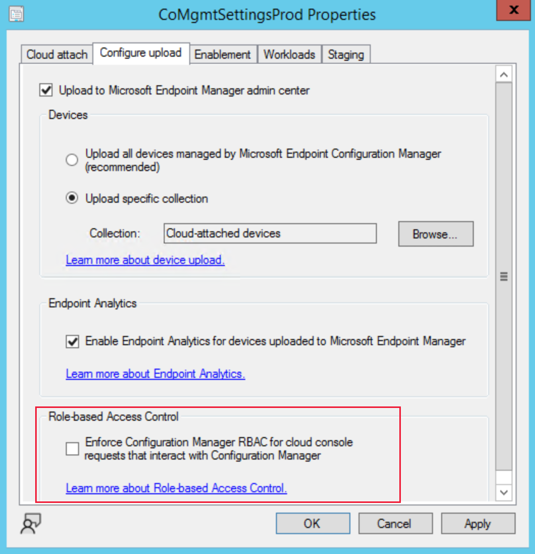 - V konzole Configuration Manager zakažte vynucování Configuration Manager řízení přístupu na základě role pro klienty připojené ke cloudu.