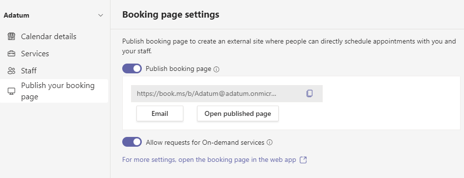 Pokud chcete lidem umožnit, aby si na stránce rezervace mohli vyžádat schůzky na vyžádání, zapněte možnost Povolit žádosti o služby na vyžádání.