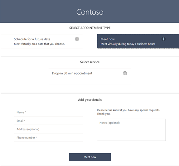 - Typ schůzky na vyžádání: Používá se zákazníky, klienty a pacienty pro schůzky na vyžádání. Schůzky na vyžádání jsou určené pro služby, které jsou poskytovány na vyžádání, podobně jako v čekárně. Tato funkce vyžaduje Teams Premium.