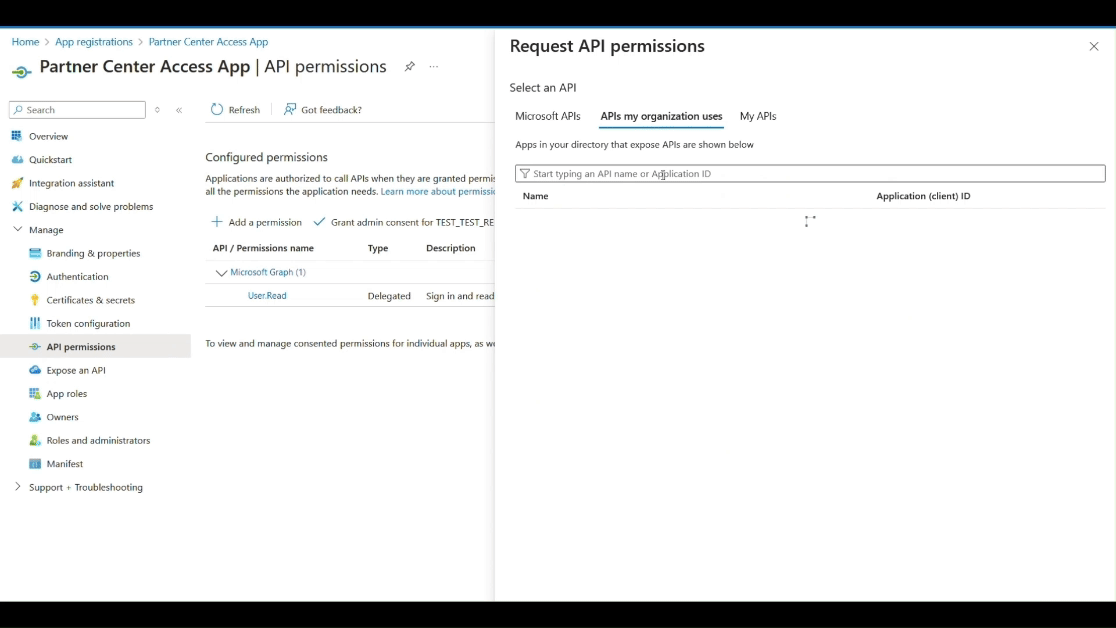Vyberte Spravovat>oprávnění rozhraní API a pak vyberte tlačítko +Přidat oprávnění. Na bočním panelu vyberte rozhraní API, která moje organizace používá .