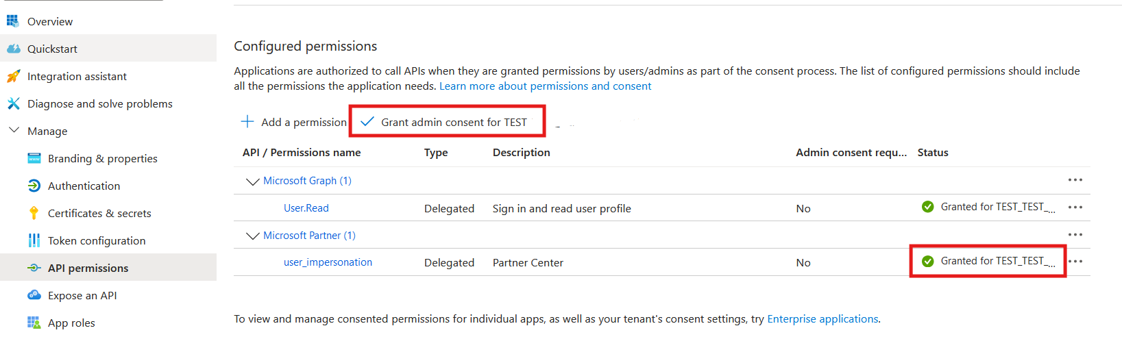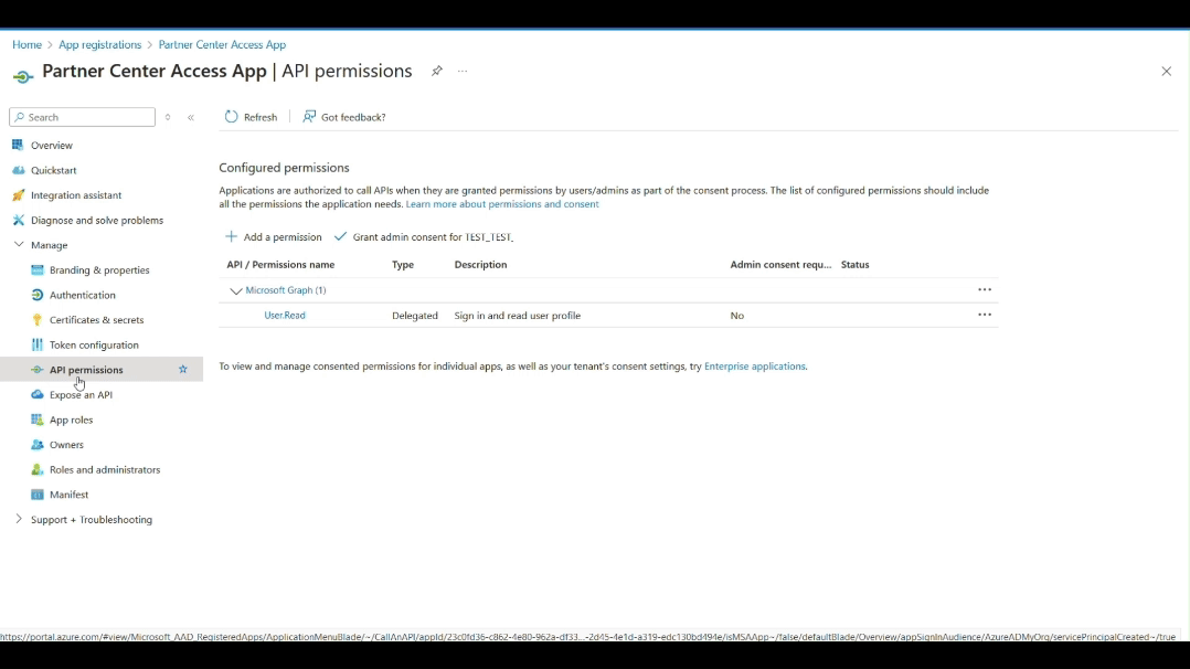 Dále musíte do této klientské aplikace přidat oprávnění rozhraní API nebo delegování (partner Microsoftu), aby bylo možné vygenerovat tokeny rozhraní API Partnerského centra.