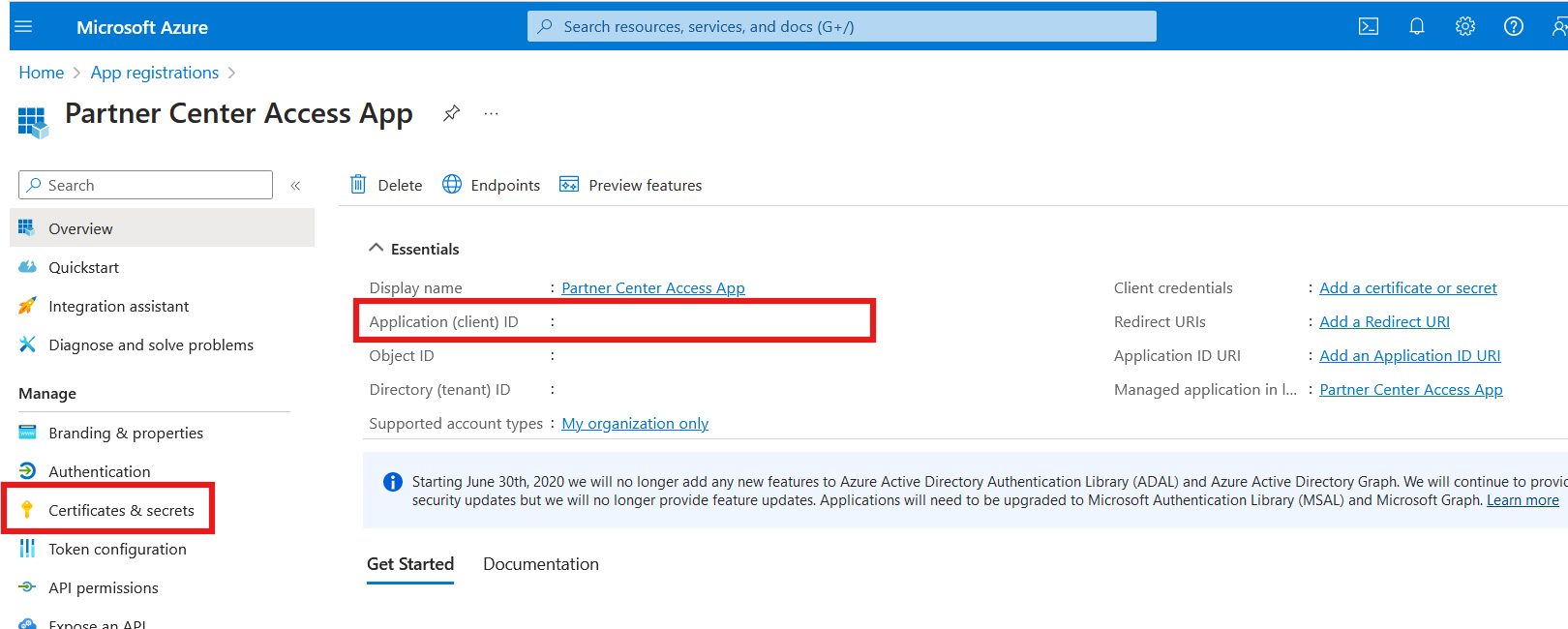 Po registraci aplikace vyhledejte ID klienta a vytvořte tajný klíč klienta, jak je zvýrazněné v této ukázce: