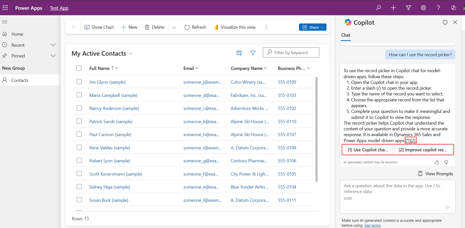 V Copilot Studio můžete přidat další zdroje znalostí. Můžete například přidat odkaz na externí veřejný web, jako je dokumentace Power Apps přidáním https://learn.microsoft.com/power-apps/ jako znalosti, a umožnit tak Copilot chatu odpovídat na otázky týkající se vytváření aplikací v Power Apps. Dalším příkladem je nahrání interních znalostí vaší organizace jako dokumentu, který umožní Copilot chatu reagovat na relevantní dotazy, které nejsou součástí dat aplikace.