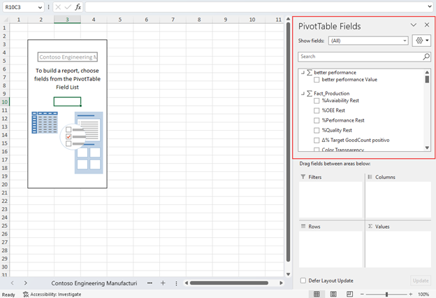 Když vyberete Vložit kontingenční tabulku, přidá se prázdná kontingenční tabulka do nového listu v excelovém sešitu. V PivotTable Fields můžete zobrazit všechny tabulky a metriky ze sémantického modelu Power BI. Sestavu můžete začít vytvářet v Excelu.