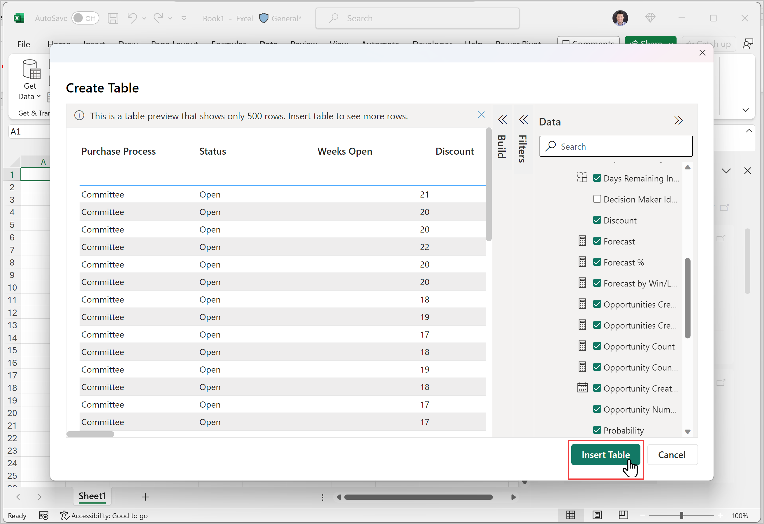 Když vyberete Vložit tabulku, otevře se dialogové okno Vytvořit tabulku, kde můžete k návrhu požadované tabulky použít podokna Data, Sestavení a Filtry. Pomocí tlačítka Vložit tabulku přidejte tabulku do excelového listu.