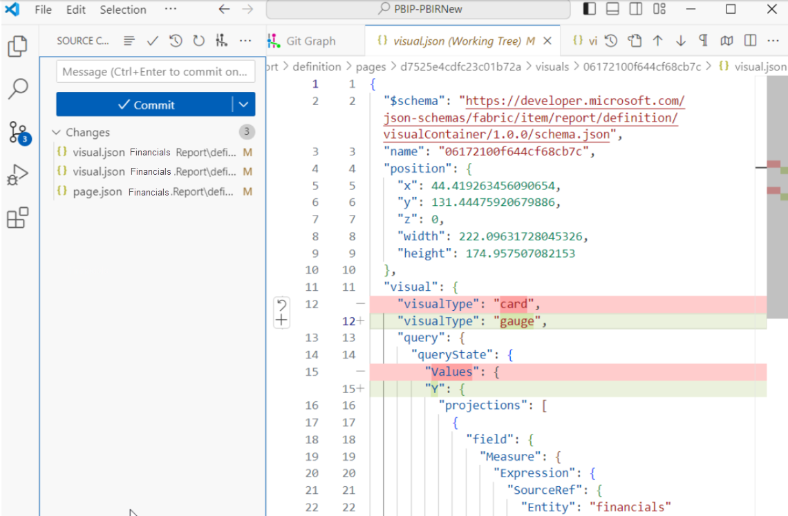 Formát souboru PBIR zjednodušuje sledování změn a řešení konfliktů při slučování. Používá správně formátovaný JSON a uspořádá každý vizuál, stránku, záložku atd. v samostatných souborech v rámci struktury složek.