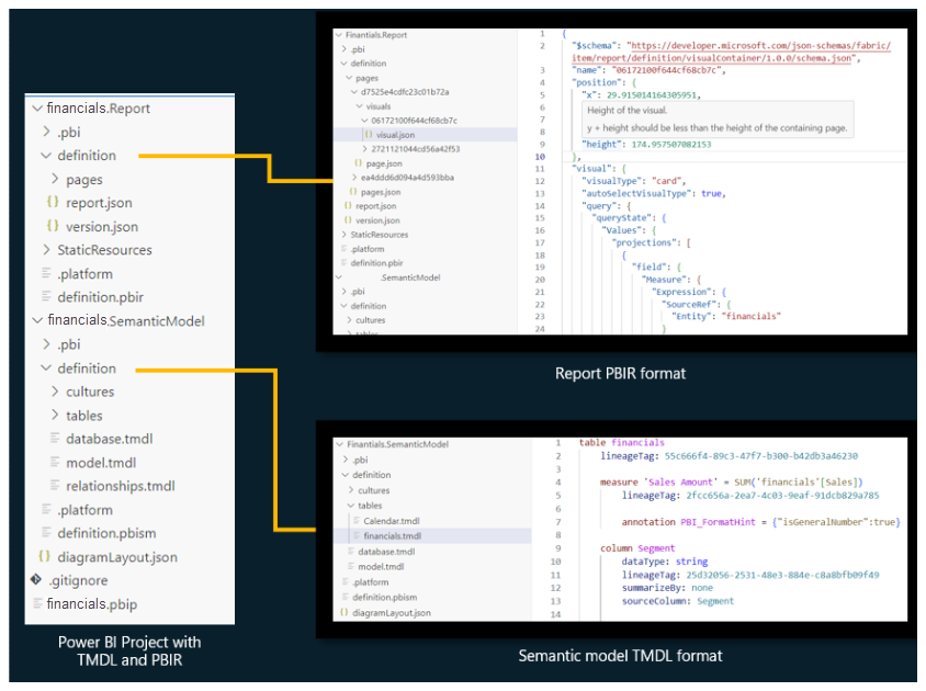 Na rozdíl od formátu PBIR starší verze (report.json) je PBIR veřejně zdokumentovaný formát. Tento formát umožňuje úpravy aplikací mimo Power BI. Každý soubor má veřejné schéma JSON, které dokumentuje každou vlastnost a umožňuje editorům kódu, jako je Visual Studio Code, provádět ověřování syntaxe při úpravách. Při otevření Power BI Desktop ověří změněné soubory PBIR, aby se zajistilo úspěšné načtení.