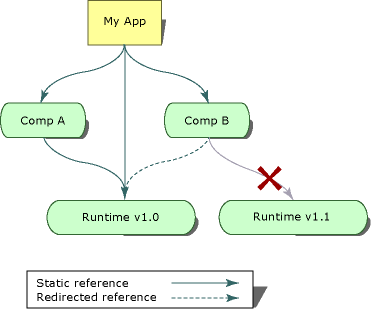 In the following illustration , the application MyApp uses two components, Comp A and Comp B. MyApp and Comp A were built with runtime version 1.0, so they contain static references to runtime version 1.0. Component Comp B contains a static reference to a .NET Framework assembly that shipped with runtime version 1.1, but because of unification, is redirected to run using the .NET Framework assembly that shipped with runtime version 1.0.
