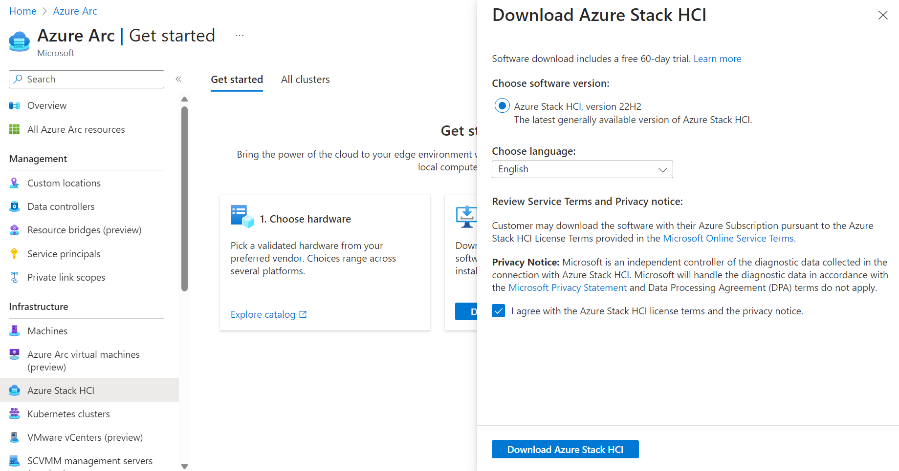 The first step in deploying Azure Stack HCI is to download Azure Stack HCI software from the Azure portal. The software download includes a free 60-day trial. However, if you've purchased Azure Stack HCI Integrated System solution hardware from the Azure Stack HCI Catalog through your preferred Microsoft hardware partner, the Azure Stack HCI software should be pre-installed. In that case, you can skip this step and move on to Create an Azure Stack HCI cluster.