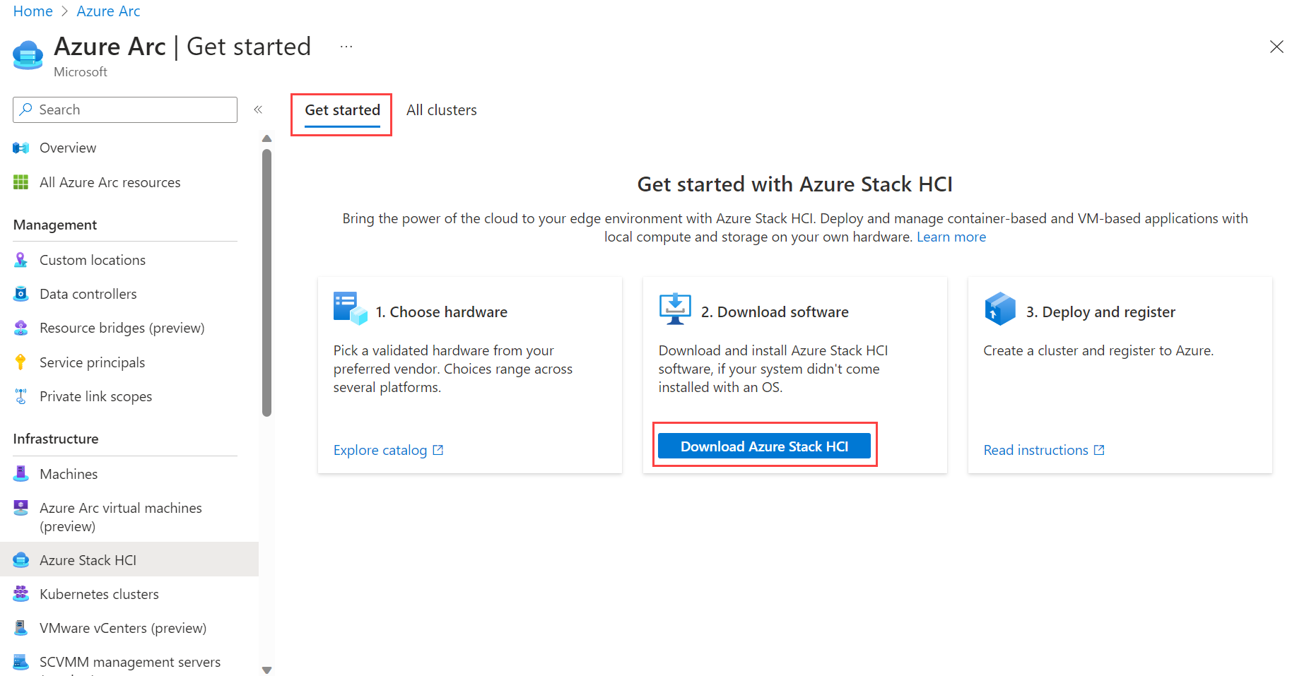 After you select Azure Stack HCI, you're directed to the Azure Stack HCI Get started page, with the Get started tab selected by default.