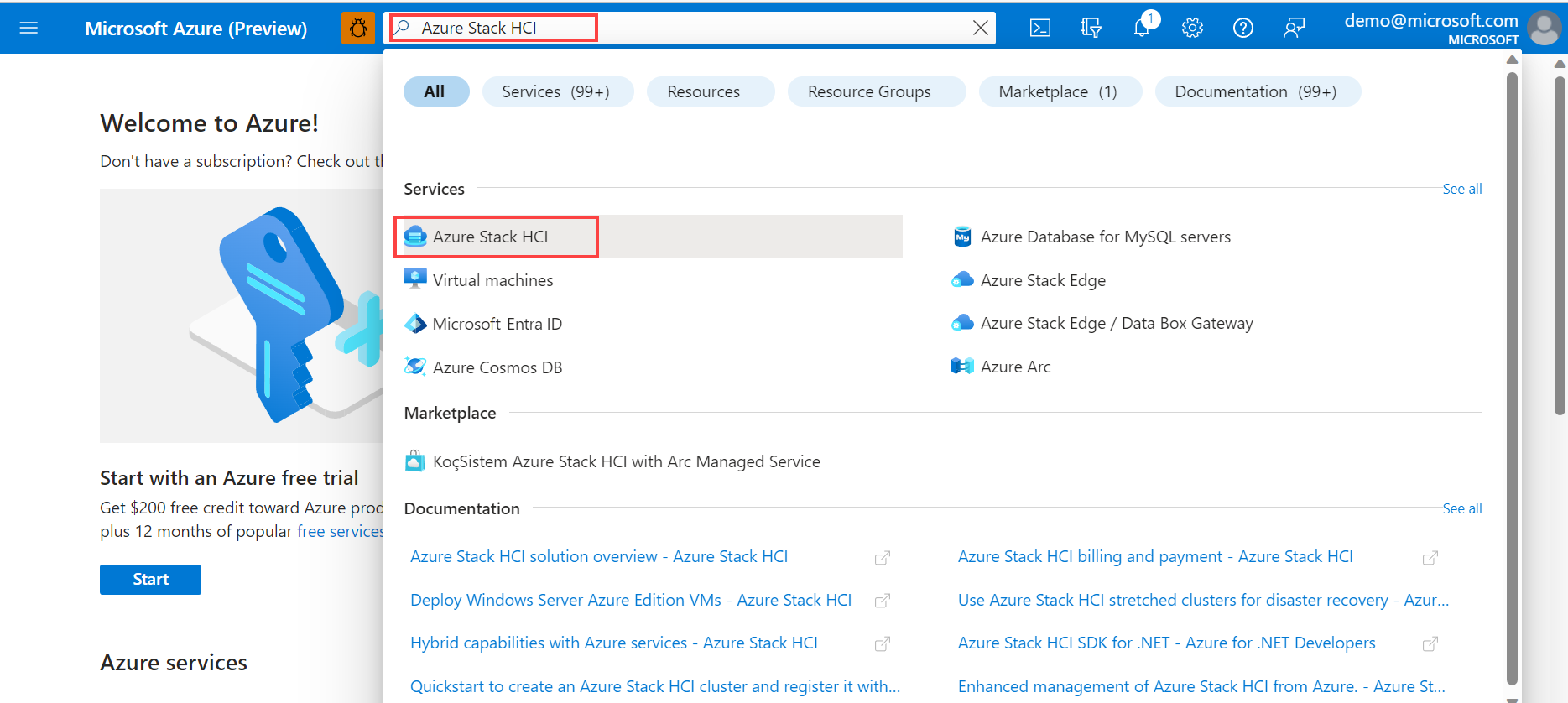 In the Azure portal search bar at the top, enter Azure Stack HCI. As you type, the portal starts suggesting related resources and services based on your input. Select Azure Stack HCI under the Services category.
