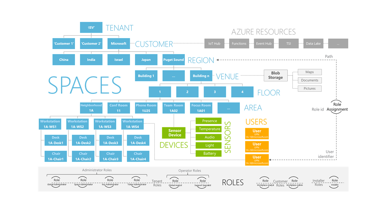 Prostorový graf spojuje prostory, zařízení, senzory a uživatele. Každá z nich je propojená způsobem, který modeluje skutečný svět. V této ukázce má místo 43 čtyři patra, z nichž každá má mnoho různých oblastí. Uživatelé jsou přidruženi ke svým pracovním stanicím a mají přístup k částem grafu. Správce má práva provádět změny prostorového grafu, zatímco návštěvník má práva k zobrazení pouze určitých dat o budově.