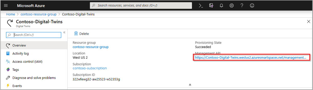 Po nasazení služby Digital Twins z webu Azure Portalse automaticky vygeneruje adresa URL Swagger rozhraní API pro správu. Zobrazí se na webu Azure Portal v části Přehled s následujícím formátem.