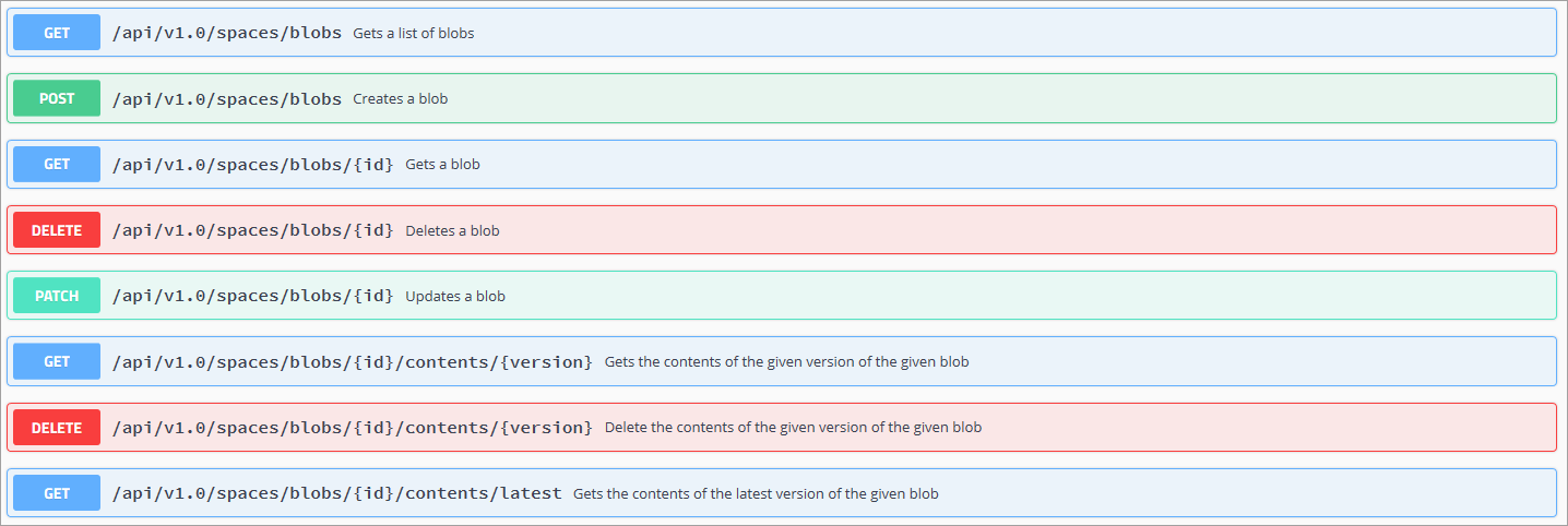 Bloby můžete také připojit k prostorům. Následující obrázek uvádí všechny koncové body rozhraní API prostoru zodpovědné za zpracování objektů blob. Vypíše také všechny parametry cesty, které se mají předat do těchto koncových bodů.
