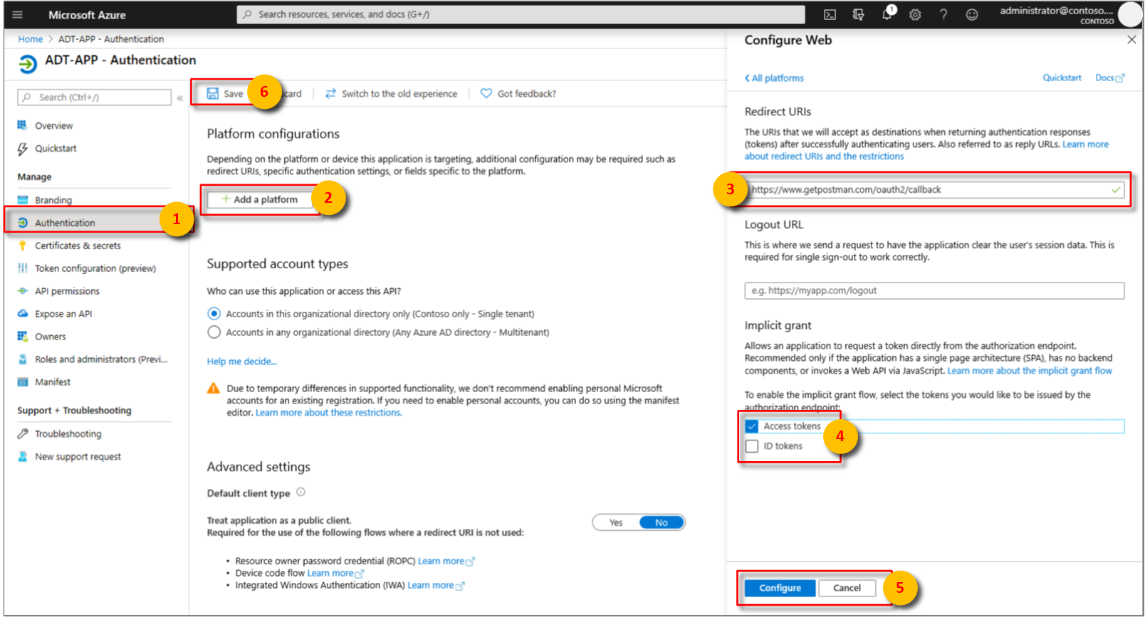 https://www.getpostman.com/oauth2/callback.Pokud chcete povolit použití implicitního toku udělení OAuth 2.0, zaškrtněte políčko Implicitní udělení>přístupových tokenů. Vyberte Konfigurovata pak Uložit.