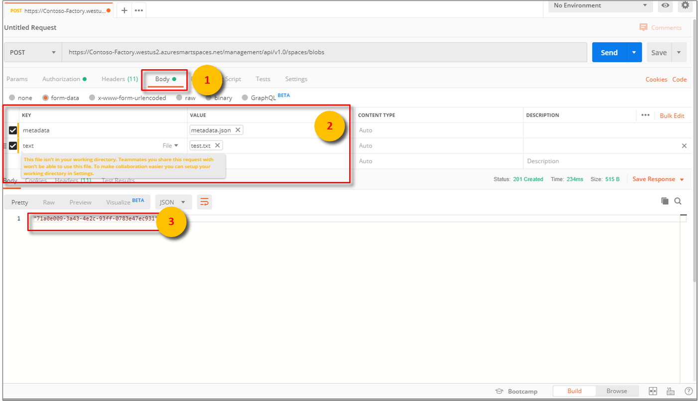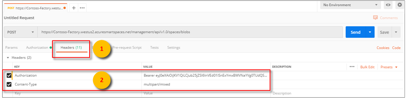 Po dokončení předchozích kroků nakonfigurujte Nástroj Postman tak, aby vytvořil ověřený požadavek POST s více částmi HTTP: