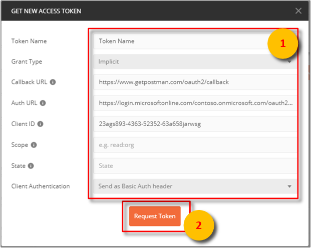(No improvements necessary, the translation is already optimal.) Hodnota Typ udělení ImplicitAdresa URL zpětného volání https://www.getpostman.com/oauth2/callbackOvěřovací URL adresa Použijte autorizační adresu URL z kroku 1 ID klienta Použijte ID aplikace pro aplikaci Azure Active Directory, která byla vytvořena nebo znovu použita z předchozí části. Obor Ponechte prázdné. Stát Ponechte prázdné. Ověřování klientů Send as Basic Auth headerKlient by se teď měl zobrazit takto: