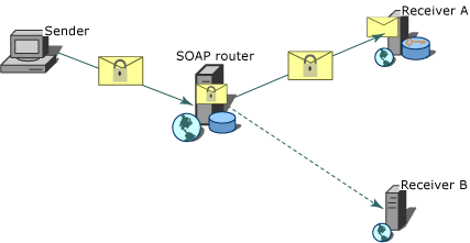 The following graphic illustrates that only the intended recipient of an encrypted SOAP message can access the encrypted portions of the SOAP message, as it is the only one with the private key that decrypts the SOAP message.