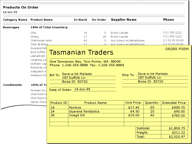 Next, gather all the forms and reports that contain information the database should be able to produce. The company currently uses a printed report to keep track of products being ordered and an order form to take new orders. The following illustration shows these two documents.