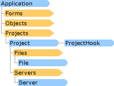 The object hierarchy for a project consists of the project, a project object, and its associated ProjectHook object. A project object contains a files collection, consisting of files in the project, and a servers collection, consisting of Automation servers created from the project. The following diagram illustrates the project object hierarchy within the Visual FoxPro object model: