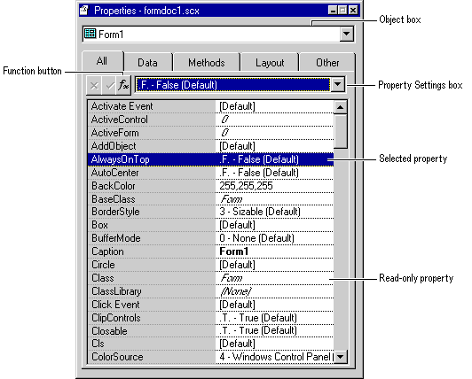 The primary point of control for all objects in your form is the Properties window. The Properties window displays the properties, events, and methods and their settings for a selected form, data environment, cursor, relation, or control.