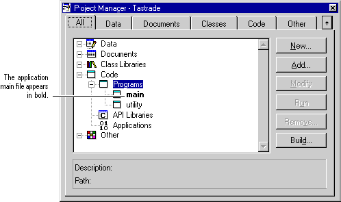 Main files link each component together and set the starting point for your application. The main file serves as the execution starting point for your application, and can consist of a program or form. When users run your application, Visual FoxPro launches the main file for your application, which in turn runs all other components as needed. All applications must have a main file. Usually, the best choice is to create a main program in your application. However, you can combine the functionality of the main program and the initial user interface by using a form as the main program.