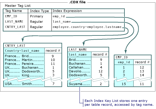 Two of the tags in the diagram, emp_id and last_name, represent indexes based on single fields. The cntry_last index orders records using a simple two-field index expression.