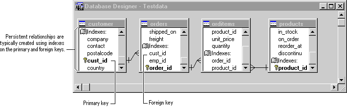 In Visual FoxPro, you use indexes to establish persistent relationships between tables in a database. You create a persistent relationship between indexes rather than between fields, which enables you to relate tables based on a simple or a complex index expression.