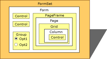 The class hierarchy and the container are two separate entities. Visual FoxPro looks for event code up through the class hierarchy, whereas objects are referenced in the container hierarchy. To manipulate an object, you need to identify it in relation to the container hierarchy. For example, to manipulate a control on a form in a form set, you need to reference the form set, the form, and then the control. For an explanation of class hierarchies, see Calling Event Code up the Class Hierarchy.