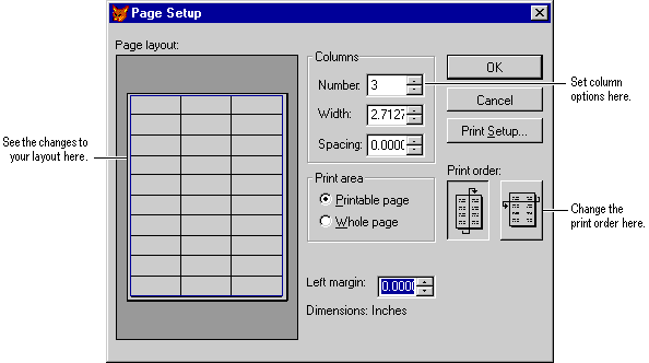 Page Setup dialog box with columns defined