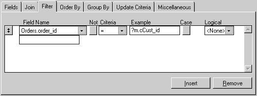 First, in the View Designer create a parameterized view for the orders. When you create the view in the View Designer, set the selection criterion for the foreign key to a variable. In the following example, the variable is called m.cCust_id.