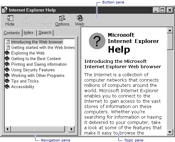 | Topic Pane (hwndHTML) | Displays the selected help topic, or the default help topic. |