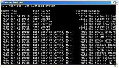 But that’s just the beginning; as we noted, you can also use Get-EventLog to look at the events in your event log. For example, this command retrieves all the events in the System event log: