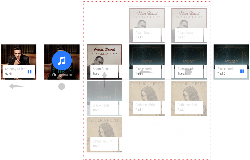 Primární navigační vzor pro Wear je řada karet uspořádaných svisle. Každá z těchto karet může mít přidružené akce, které jsou vrstvené na stejném řádku. Třída GridViewPager poskytuje tuto funkci; dodržuje stejný koncept adaptéru jako ListView.
