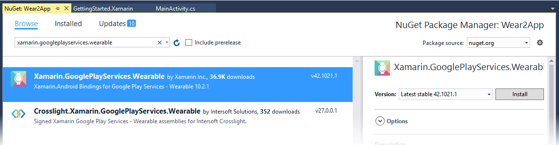 Kromě Xamarin.Android.Wear doporučujeme nainstalovat Xamarin.GooglePlayServices.Wearable NuGet: