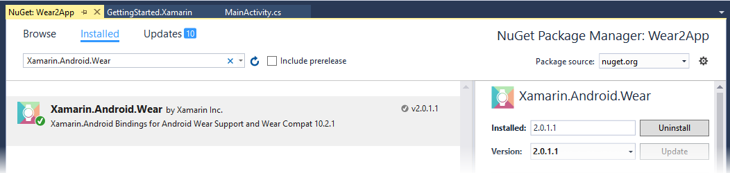 Pokud chcete vytvořit aplikaci Wear 2.0 s Xamarin.Androidem, musíte do projektu přidat balíček Xamarin.Android.Wear v2.0 (klikněte na kartu Procházet):