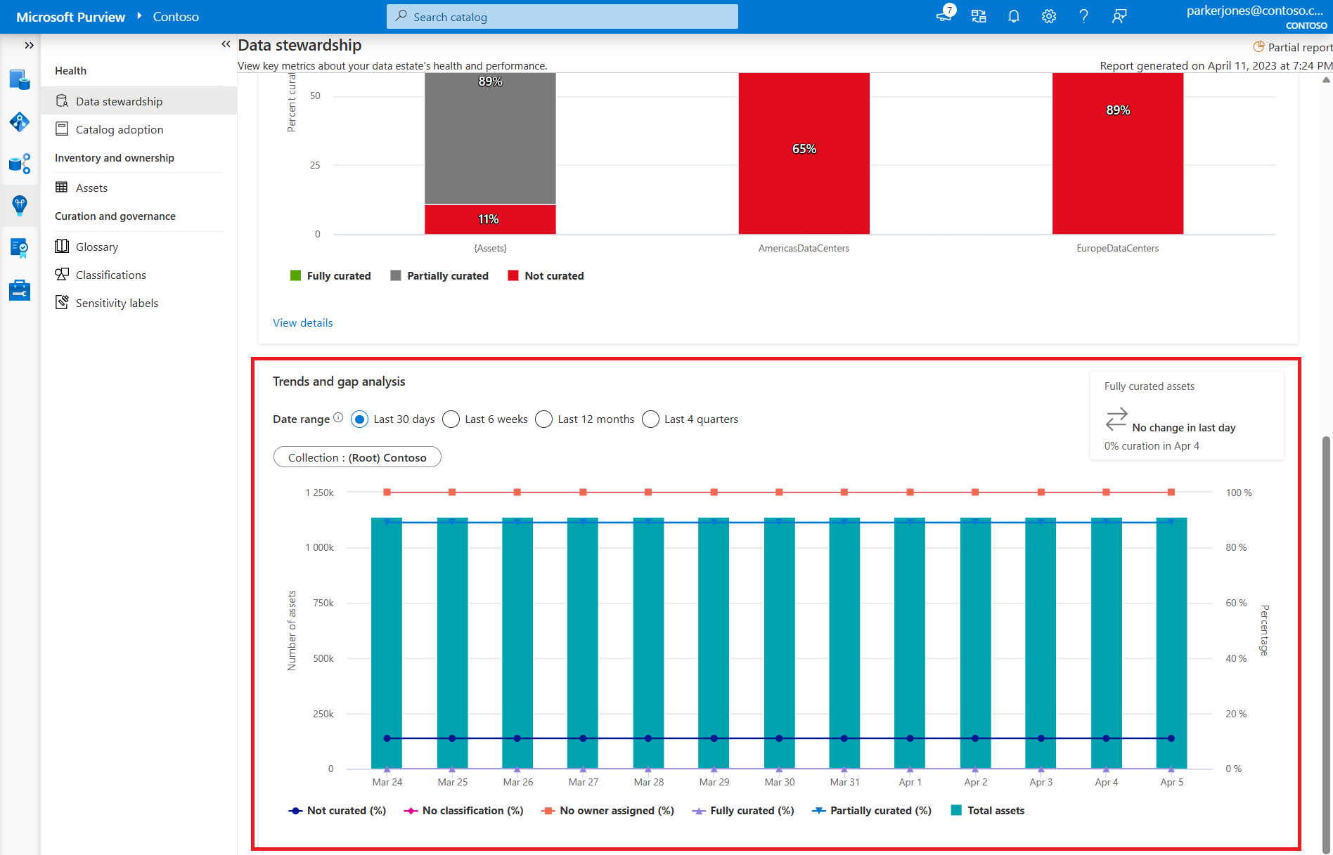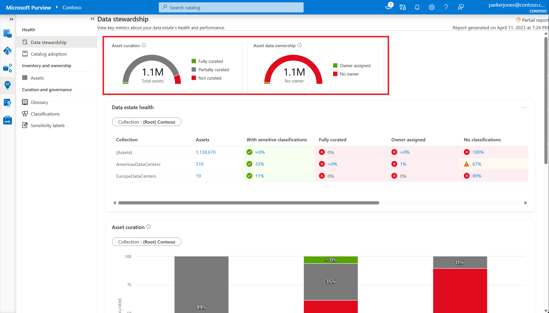 - Fully curated assets: Count of assets that have a data owner, at least one classification, and a description.