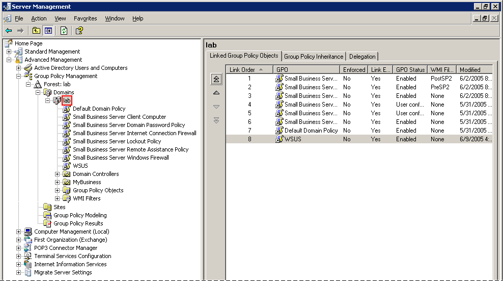 In Server Management, expand Advanced Management, expand Group Policy Management, expand Forest, expand Domains, and then click your Windows SBS domain.