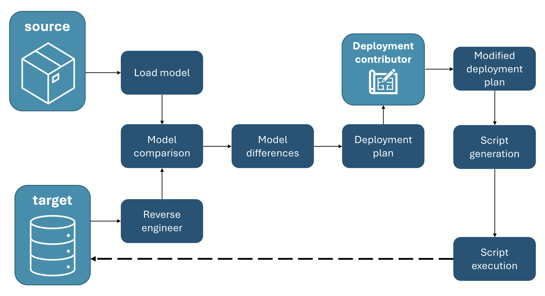 Proces nasazení pro projekty SQL podporuje rozšiřitelnost prostřednictvím přispěvatelů nasazení, kteří přistupují k plánu nasazení a mohou ho upravit (DeploymentPlanModifier) nebo implementovat akci na základě plánu (DeploymentPlanExecutor). Přispěvatelé nasazení mají přístup k plánu nasazení, výsledkům porovnání a zdrojovým a cílovým modelům. Pomocí DeploymentPlanModifier můžete pomocí přispěvatelů nasazení přidat nebo odebrat kroky z plánu nasazení nebo upravit kroky v plánu nasazení. DeploymentPlanModifiers jsou nejčastěji používanými přispěvateli nasazení.