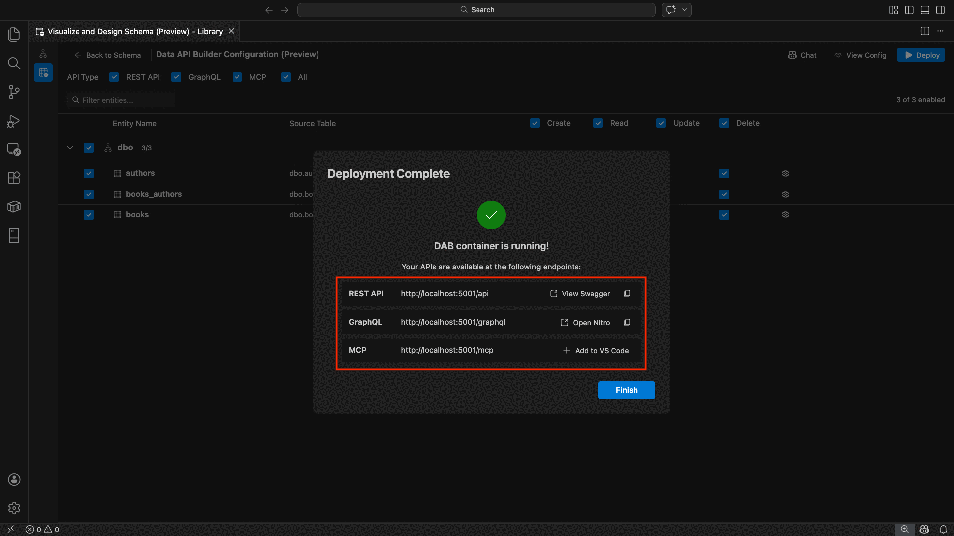 "Enable all SalesLT entities for read operations""Expose only the Customer and Product tables with full CRUD permissions""Set all entities in the dbo schema to read-only""Disable the BuildVersion and ErrorLog entities""Can you also enable MCP for the Data API builder API?"